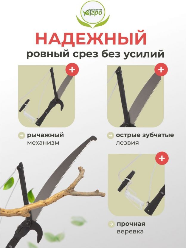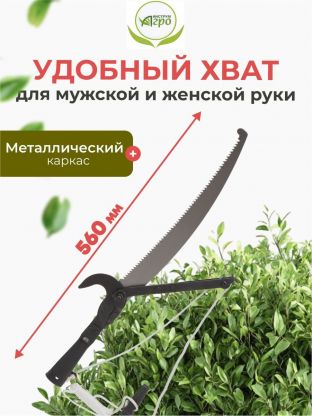 Предназначен для обрезки веток деревьев на высоте. Очень удобен для резки веток в труднодоступных местах. Металлический, комплектуется шнуром и ножовкой, без черенка, диаметр тулейки 30 мм. Длина изделия в сборе с ножовкой 530 мм.