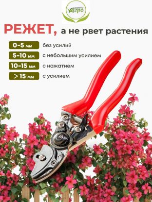 Особенностью даннного секатора является наличие зажимного механизма, с помошью которого можно удерживать после срезки цветок (удобство работы одной рукой).