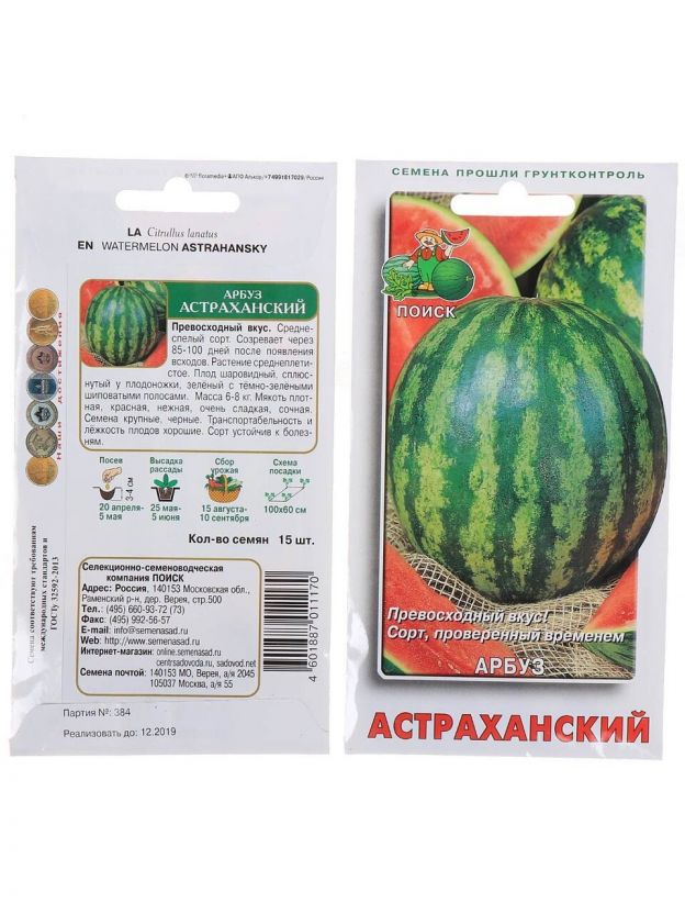 Среднеспелый сорт. Созревает через 85-100 дней после появления всходов. Растение среднеплетистое. Плод шаровидный, сплюснутый у плодоножки, зелёный с тёмно-зелёными шиповатыми полосами. Масса 6-8 кг. Мякоть плотная, красная, нежная, очень сладкая, сочная. Семена крупные, черные. Транспортабельность и лёжкость плодов хорошие.