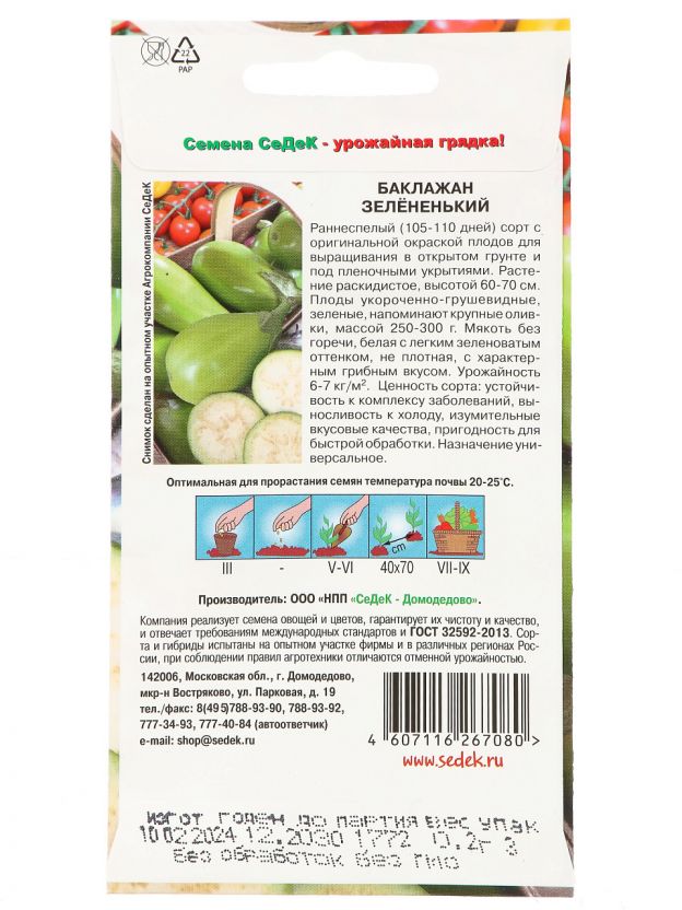Семена Баклажан, Зелененький, 0.2 г, цветная упаковка, Седек