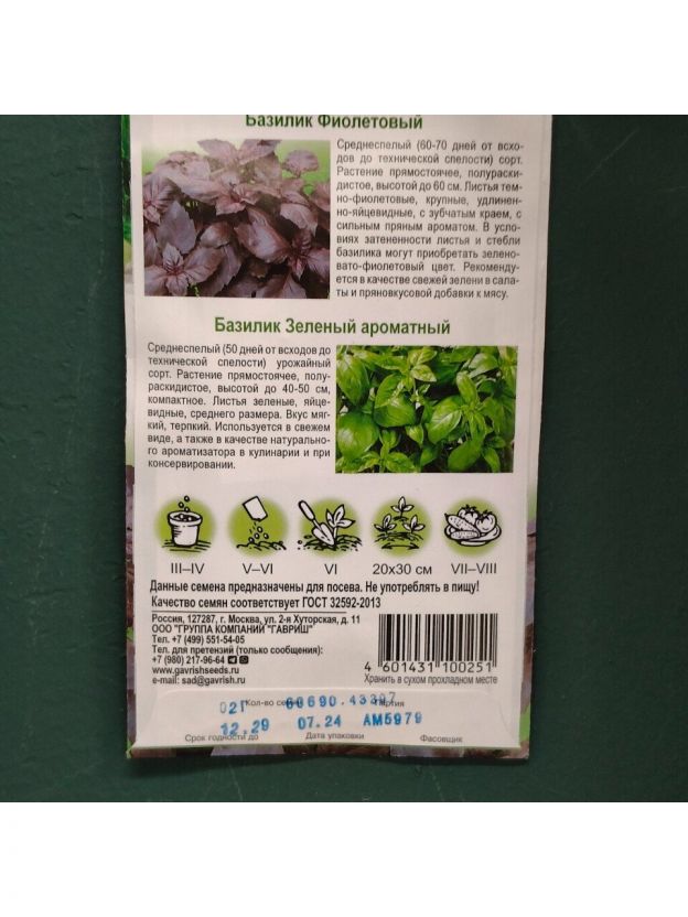 Семена Базилик, Дуэт, 0.1 г, Фиолетовый + Зеленый ароматный, 0.1 г, цветная упаковка, Гавриш