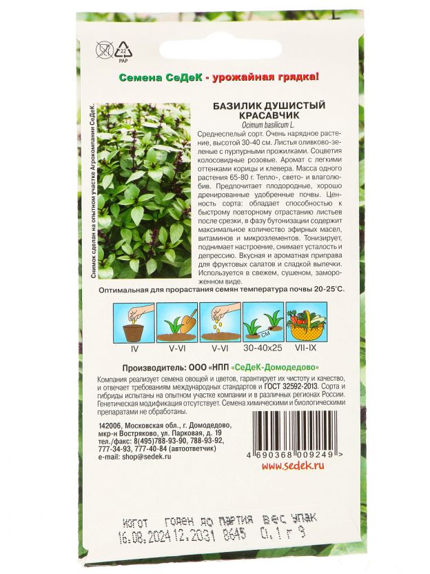 Семена базилика Душистый красавчик от бренда Седек — это идеальное решение для тех, кто ищет, какой базилик выбрать для свежих салатов, песто или ароматного чая. Среднеспелый однолетний сорт быстро всходит и отлично развивается как в домашних условиях, так и на даче. Цветная упаковка защищает семена от влаги и света, что гарантирует высокую всхожесть. Для тех, кто спрашивает, чем отличается этот базилик от других сортов, — Душистый красавчик выделяется насыщенным ароматом и устойчивостью к перепадам температур.