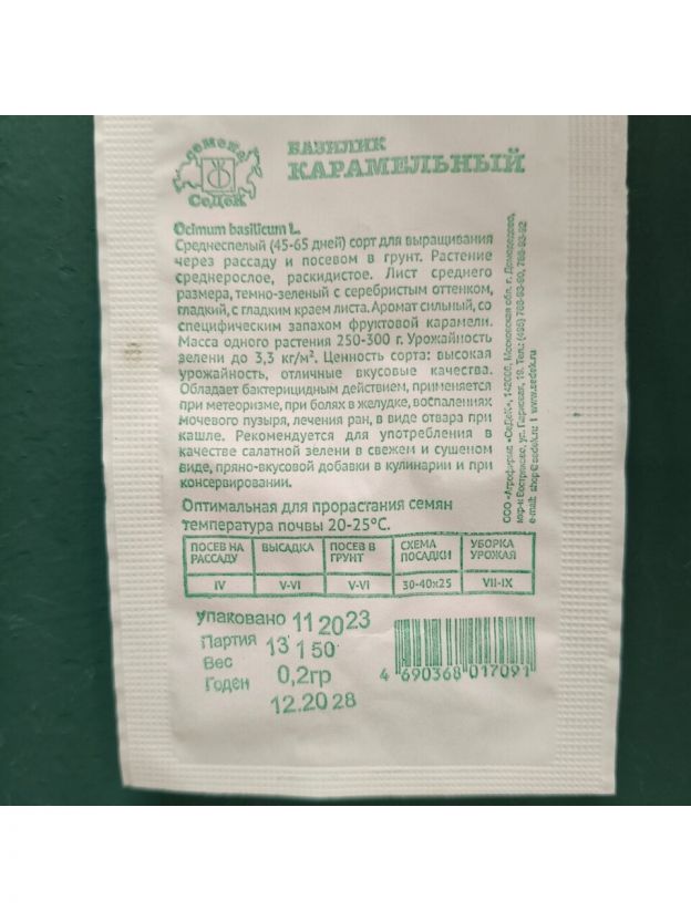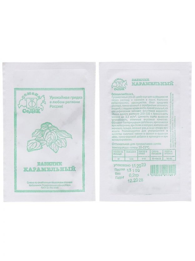 Базилик Карамельный это среднеспелый сорт для выращивания через рассаду и посевом в грунт. Созревание в среднем занимает 45-65 дней. Растение среднерослое, раскидистое. Лист среднего размера, темно-зеленый с серебристым оттенком, гладкий, с гладким краем листа. Аромат сильный, со специфическим запахом фруктовой карамели. Масса одного растения 250-300 г.