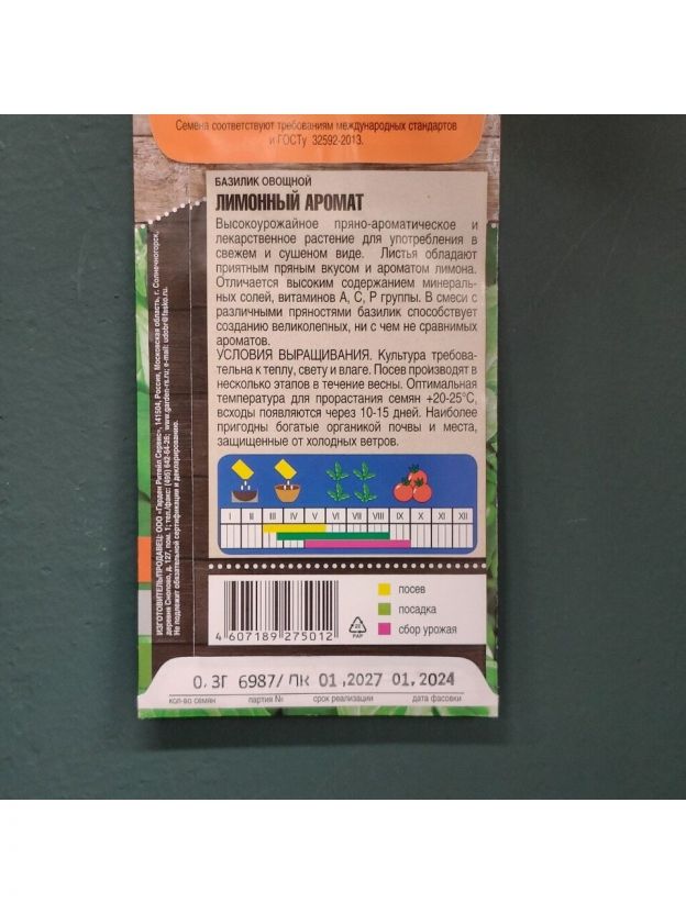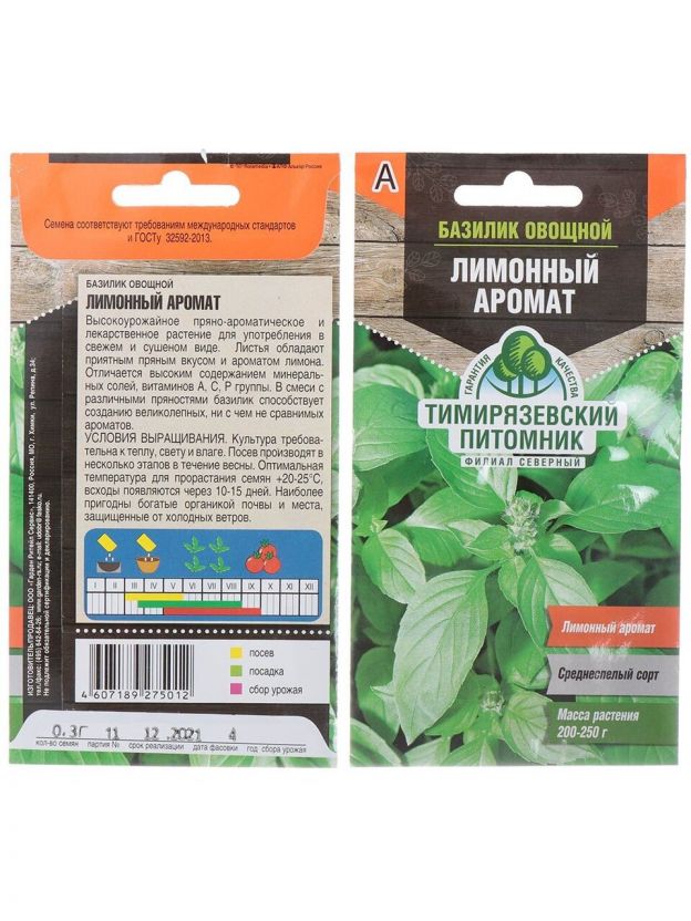Семена Базилик, Лимонный, 0.3 г, цветная упаковка, Тимирязевский питомник