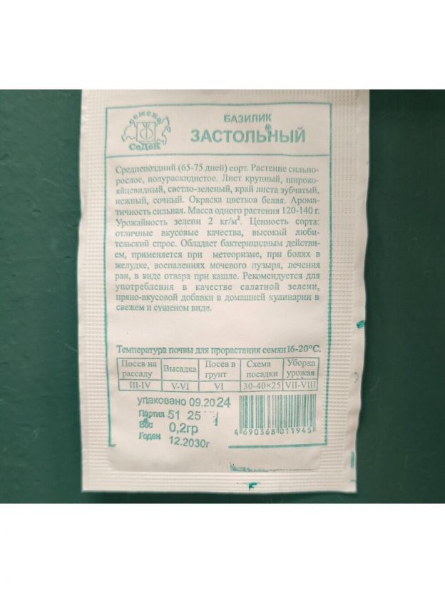 Среднепоздний (65-75 дней) сорт. Растение сильнорослое, полураскидистое. Лист крупный, широкояйцевидный, светло-зеленый, край листа зубчатый, нежный, сочный. Окраска цветков белая. Ароматичность сильная. Масса одного растения 120-140 г. Урожайность зелени 2 кг/м2.