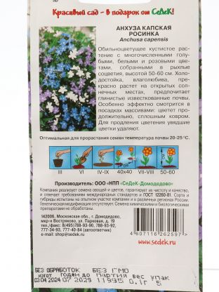 Семена анхузы «Росинка» от Седек поставляются в свежей цветной упаковке весом 0.1 г, рассчитаны на посев в течение текущего сезона. Всхожесть соответствует ГОСТу, подходит для выращивания в различных регионах России.