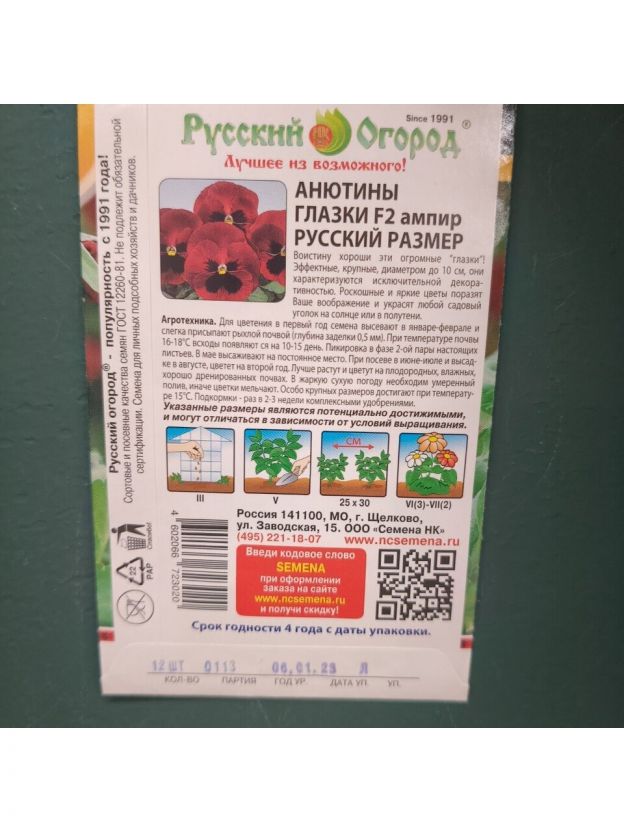 Семена Цветы, Анютины глазки, F2 Aмпир, 0.1 г, Русский размер, цветная упаковка, Русский огород
