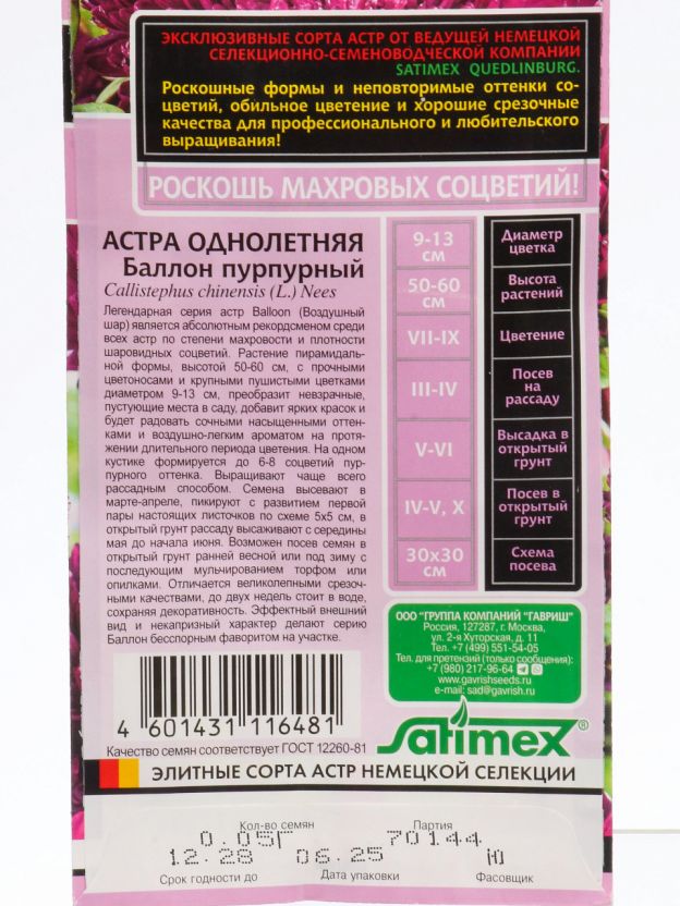 Часто спрашивают: чем отличается густомахровая астра Баллон от обычных сортов? Густомахровые астры имеют более плотные, объёмные цветки, которые дольше сохраняют декоративность и лучше смотрятся в букетах. Для тех, кто ищет, что лучше для посадки на сезон — однолетняя астра Баллон пурпурный требует минимального ухода, устойчива к перепадам погоды и быстро зацветает после посева. Семена поставляются в цветной упаковке, что удобно для хранения и подарка.