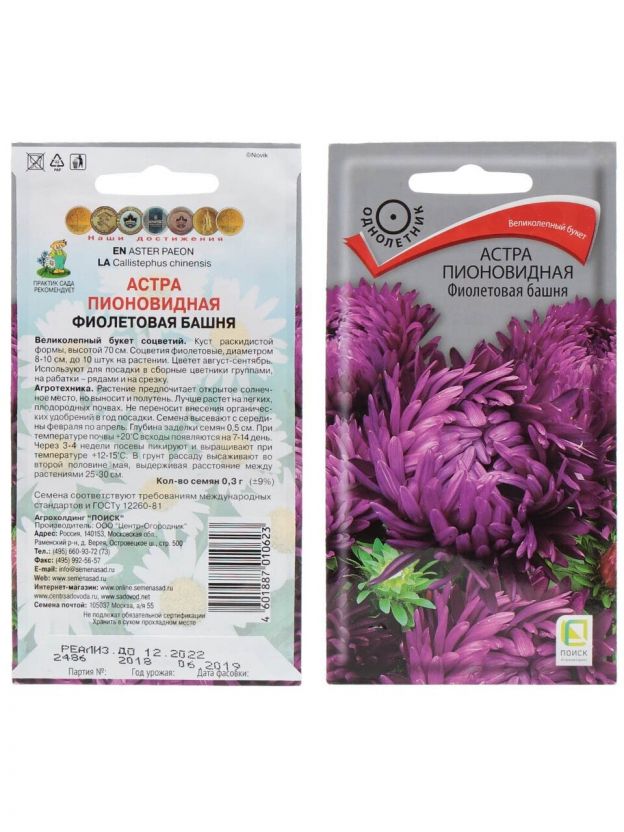 Семена Цветы, Астра, Фиолетовая башня, 0.3 г, пионовидная, темно-красная, цветная упаковка, Поиск