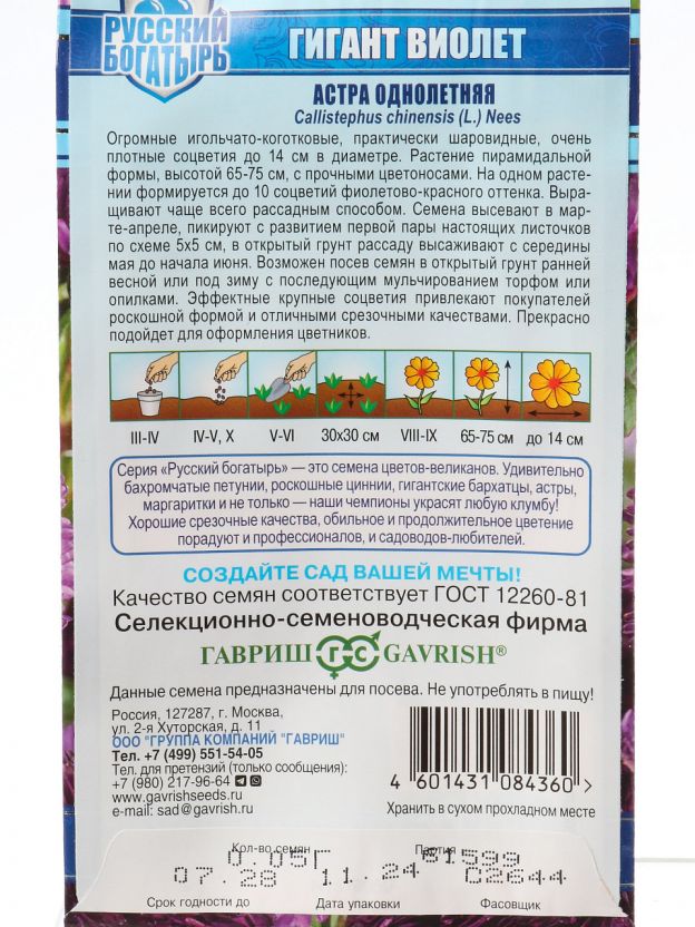 Семена Цветы, Астра, Гигант виолет, 0.05 г, Русский богатырь, однолетняя, игольчато-коготковая, цветная упаковка, Гавриш