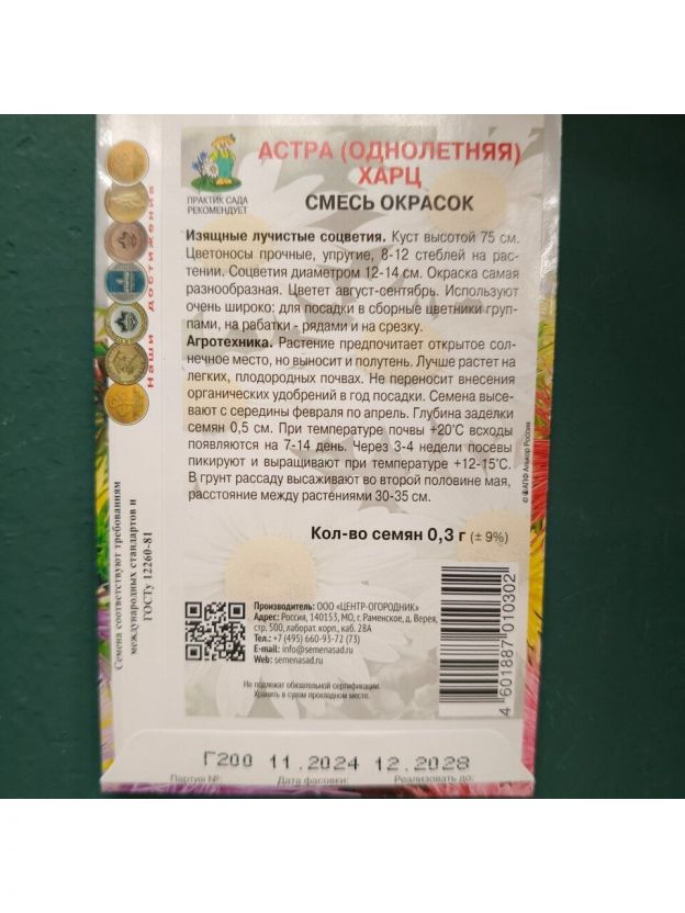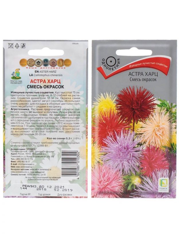 Семена Цветы, Астра, Харц, 0.3 г, смесь окрасок, цветная упаковка, Поиск