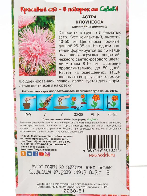 Семена Цветы, Астра, Клоунесса, 0.2 г, цветная упаковка, Седек