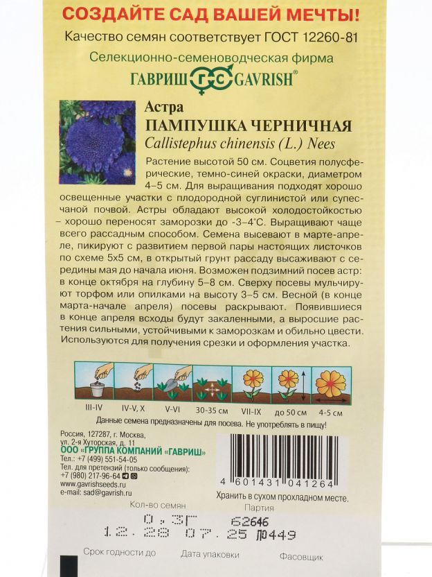 Семена Цветы, Астра, Пампушка черничная, 0.3 г, однолетняя, помпонная, цветная упаковка, Гавриш