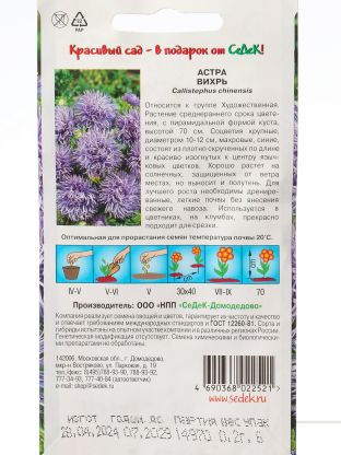 Культура: цветы; вид: астра; сорт: Вихрь; вес: 0.2 г; упаковка: цветная; жизненный цикл: однолетний; страна продавца: Россия.