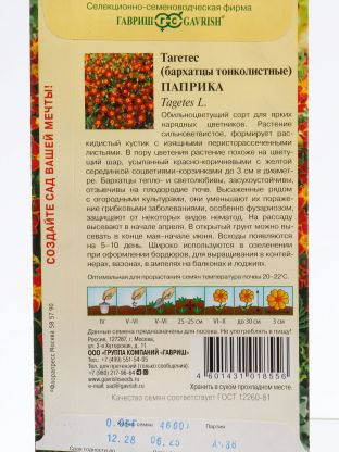 Семена Цветы, Бархатцы, Паприка, 0.05 г, тонколистные, цветная упаковка, Гавриш