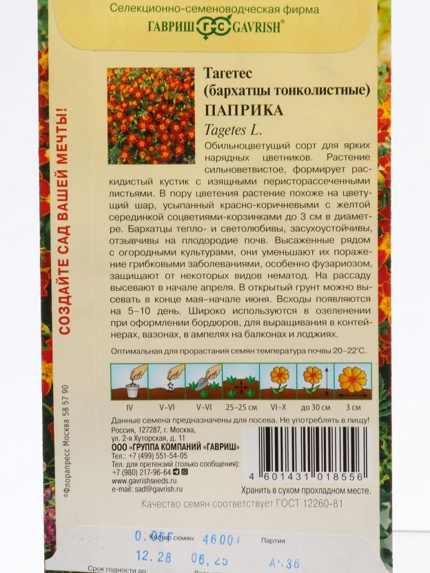 Если вы ищете, как использовать бархатцы для украшения балкона или создания бордюров, этот сорт отлично подходит для любых условий. В отличие от классических сортов, тонколистные бархатцы не вытягиваются, сохраняют форму и яркость цвета до осени. Семена в цветной упаковке от Гавриш гарантируют свежесть и высокую всхожесть, что важно для успешного результата.