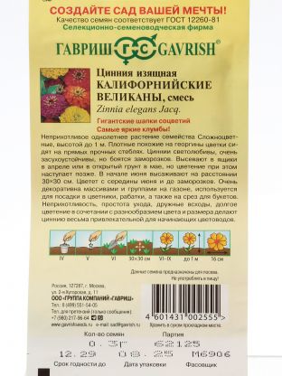 Семена Цветы, Цинния, Калифорнийские великаны, 0.3 г, смесь, цветная упаковка, Гавриш