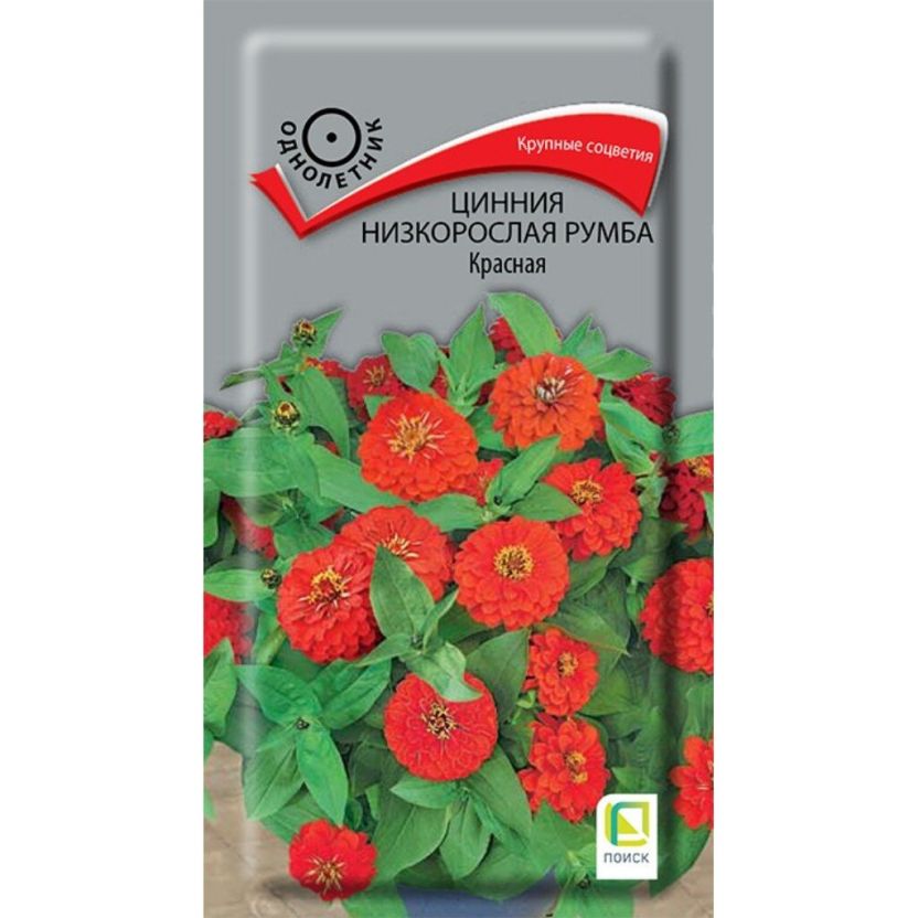 Семена Цветы, Цинния, Румба Красная, 0.1 г, низкорослая, многоцветковая, красная, цветная упаковка, Поиск
