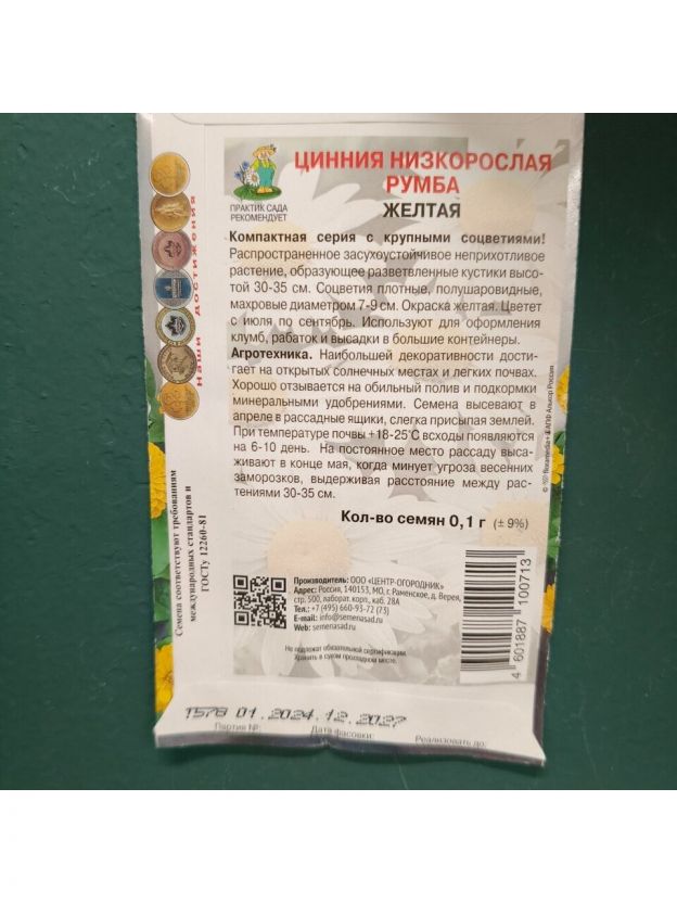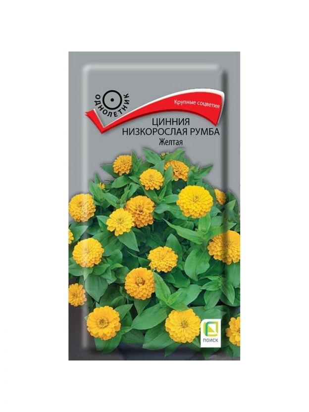 Семена Цветы, Цинния, Румба Жёлтая, 0.1 г, низкорослая, многоцветковая, красная, цветная упаковка, Поиск