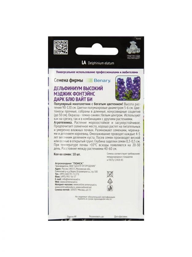 Семена Цветы, Дельфиниум, Фонтэйнс Дарк Блю Ваит Би, цветная упаковка, Поиск