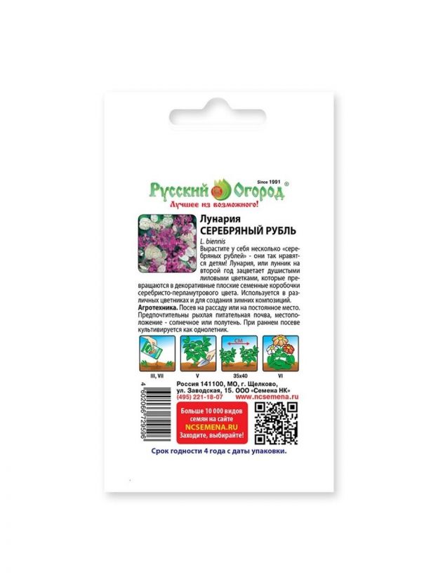 Семена Цветы, Лунария, Серебряный рубль, 0.2 г, цветная упаковка, Русский огород