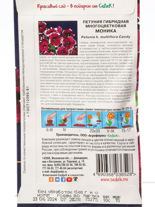 Обратите внимание на свежесть семян, срок годности и производителя. Семена петунии Моника от Седек поставляются в цветной упаковке с подробной инструкцией, что облегчает посев и уход даже новичкам.