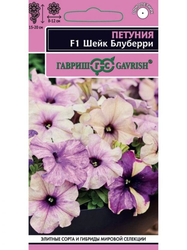 В упаковке гранулы в пробирке, серия «Элитная клумба», однолетний жизненный цикл. Бренд — Гавриш, тип — махровая, многоцветковая петуния.