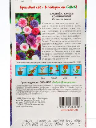 Семена василька Комплимент от бренда Седек — это однолетние цветы с насыщенными оттенками, которые легко выращивать даже новичкам. Благодаря адаптации к российскому климату, василёк отлично подходит для открытого грунта и контейнерного озеленения. Если вы ищете, какие семена цветов выбрать для дачи или балкона, обратите внимание на этот сорт: он быстро всходит, не требует сложного ухода и долго радует цветением.