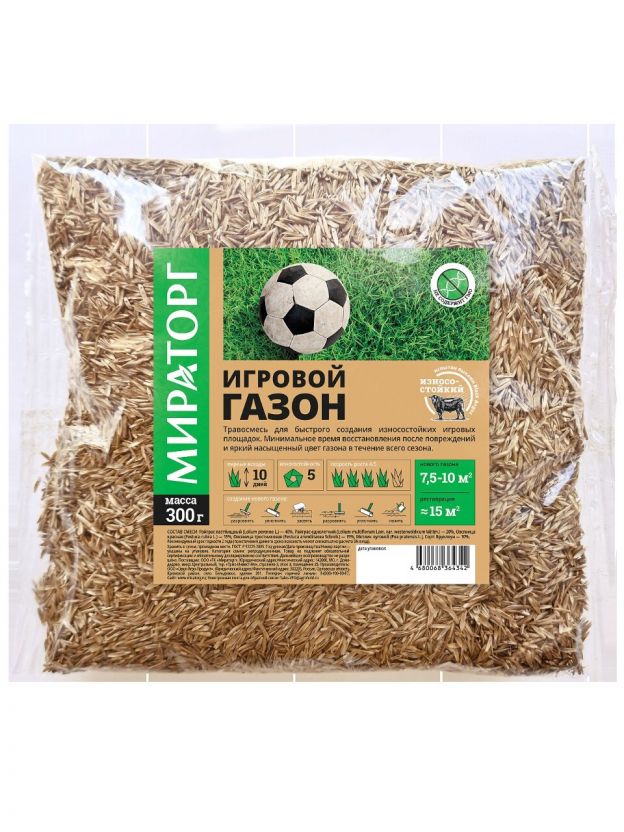 Газон «Игровой» Мираторг 0,3 кг — плотный зелёный ковёр для активных игр и отдыха. Быстрый результат, выносливость, оптимальный состав для дачи и дома.
