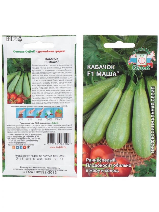 Раннеспелый (от всходов до спелости плодов 45-50 дней) гибрид. Растение кустовое, компактное, среднеоблиственное. Плоды цилиндрические, слаборебристые, бело-салатные с редкими светло-зелеными пятнами, массой 0,7-1,1 кг, с глянцевой блестящей тонкой кожицей. Мякоть белая, среднеплотная. Вкусовые качества отличные. Ценность гибрида: обильное плодоношение, хорошая завязываемость как в жаркую, так и в холодную, дождливую погоду, высокая товарность плодов, устойчивость к болезням. Рекомендуется для всех видов переработки, особенно хорошо подходит для приготовления икры.