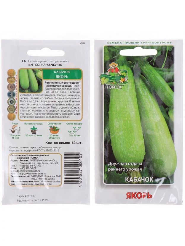 Раннеспелый сорт с дружной отдачей урожая. Период от всходов до плодоношения 38-48 дней. Растение кустовое, слабоветвящееся. Плоды цилиндрические, гладкие, со слабым сбегом к плодоножке. Масса до 0,9 кг. Кора тонкая, хрупкая. В технической спелости светло-зеленая, в биологической светло-желтая.