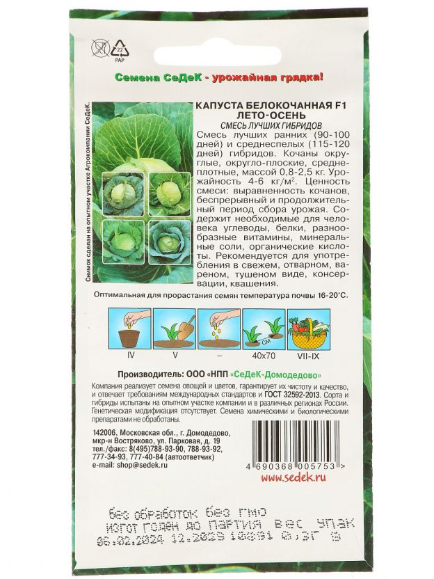 Семена Капуста белокочанная, Лето-осень F1, 0.3 г, цветная упаковка, Седек