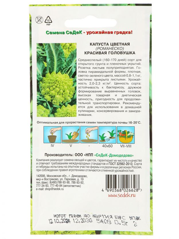 Семена цветной капусты "Красивая головушка" от бренда Седек — это надёжный выбор для тех, кто ищет, какие семена капусты лучше купить для дачи или домашнего огорода. Среднеспелый сорт позволяет получать урожай уже через 9160-170 дней после посева, а однолетний цикл упрощает планирование посадок. Благодаря проверенной селекции, семена подходят для выращивания в различных климатических зонах России, что подтверждается опытом дачников и экспертов отрасли.