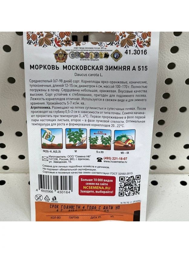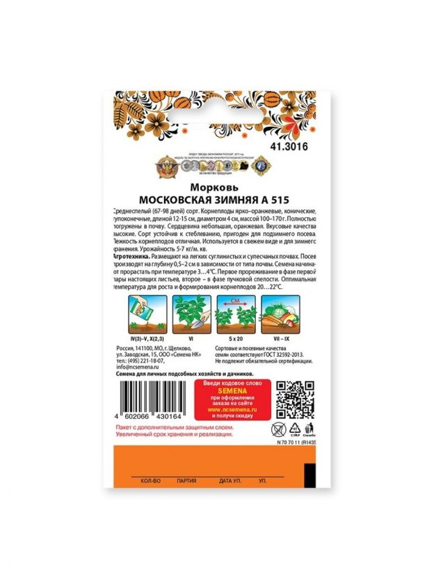 Семена Морковь, Московская зимняя А 515, 4 г, 200% NEW, цветная упаковка, Русский огород