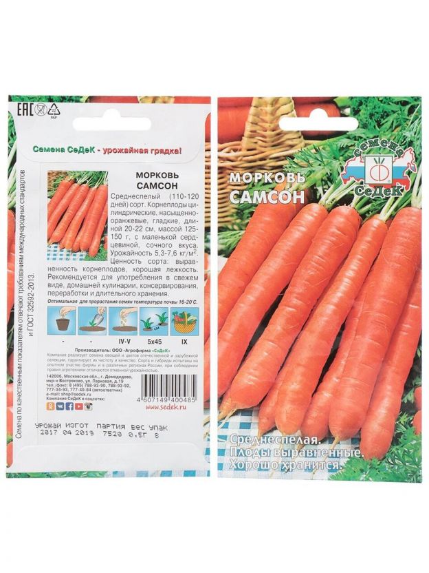 Среднеспелый (110-120 дней) сорт. Корнеплоды цилиндрические, насыщенно-оранжевые, гладкие, длиной 20-22 см, массой 125-150 г, с маленькой сердцевиной, сочного вкуса. Урожайность 5,3-7,6 кг/м2.