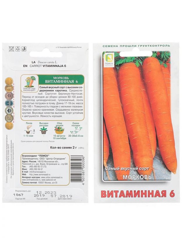 Среднеспелый сорт моркови Витаминная 6 устойчив к цветушности, обладает хорошей лежкостью и прекрасными вкусовыми качествами. Корнеплоды цилиндрической формы полностью погружены в почву, средний размер 17-19 см, а вес 100-185 г. Урожайность сорта достигает 6 кг на кв.м.