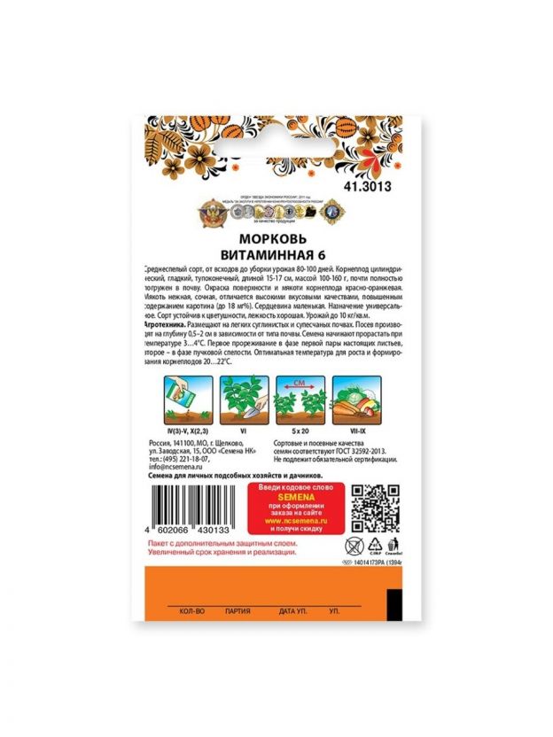 Семена Морковь, Витаминная 6, 4 г, 200% NEW, цветная упаковка, Русский огород