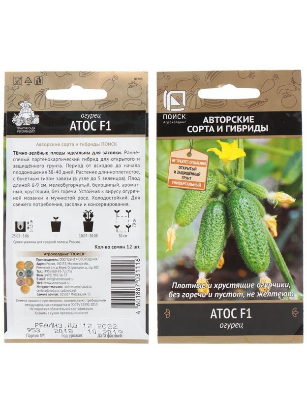 Созревание плода происходит быстро и рано. Зеленец хрустящий, короткий, до 9 см, темно-зеленого цвета. Масса огурца до 110 г. Белые шипы на зеленце. Располагаются пучком в завязи (по 5-7 штук). Желтые пятна, горечь и пустоты отсутствуют. Растение средней длины (1.5-2 м) с треугольными листьями. Тип цветения – женский. Высокая устойчивость к различным болезням и переменам климата.