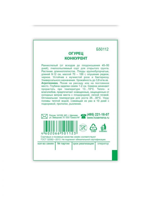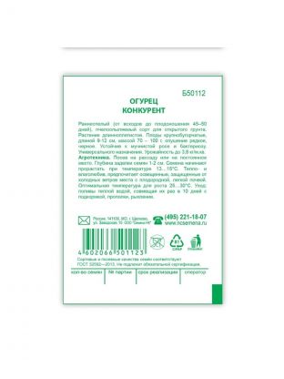 Семена Огурец, Конкурент, 0.3 г, Первая цена, белая упаковка, Русский огород
