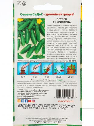 Семена огурца Кристина F1 0.2 г от Седек — ранний урожай, высокая всхожесть, цветная упаковка для удобства хранения и подарка.