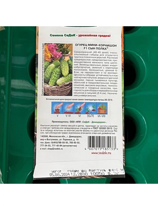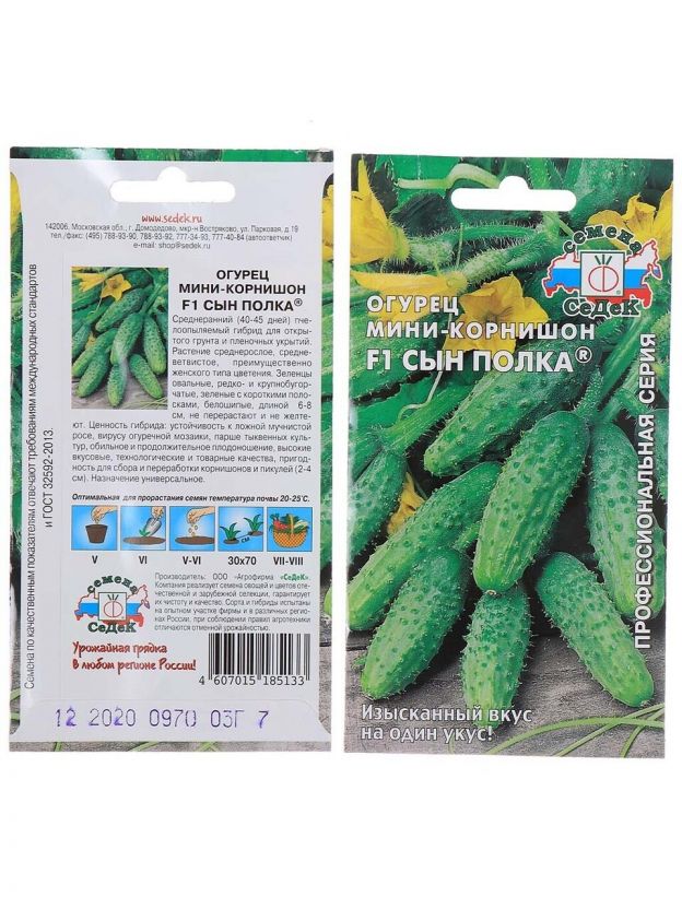 Среднеранний (45-47дней) гибрид преимущественно с женским типом цветения (90%). Растение мощное, среднеплетистое, листовая пластина средняя. Корнишоны, цилиндрические, зеленые с короткими светлыми полосами, с глянцем, крупно-бугорчатые, белошипые, длиной 7-9 см. Свойство интенсивного плодообразования, дает возможность ежедневного сбора пикулей длинной 3-5 см, диаметром 1-2 см.