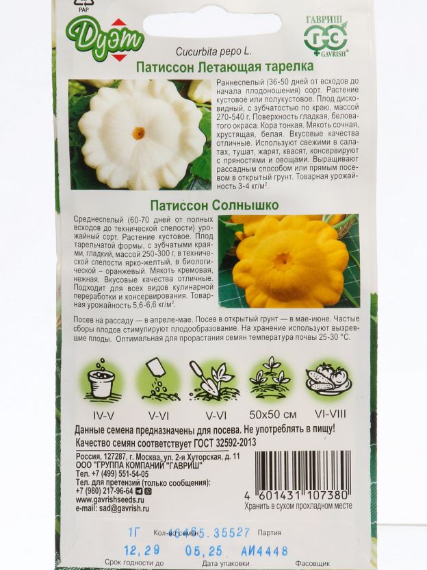 Семена патиссона Летающая тарелка + Солнышко Дуэт Гавриш – ранний урожай для дачи и дома, 2 сорта в одной упаковке для максимальной отдачи и свежести овощей.