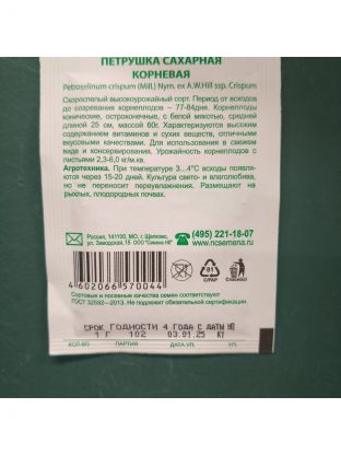 Семена петрушки корневой Сахарной - это скороспелый высокоурожайный сорт. Вступает в плодоношение на 77-84 день от всходов. Корнеплоды конические, остроконечные, с белой мякотью, средней длиной 5 см, массой 60 г. При температуре +3-4 C всходы появляются через 15-20 дней. Культура свето - и влаголюбива, но не переносит переувлажнения. Размещают на рыхлых, плодородных почвах.
