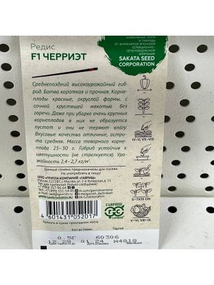 Среднепоздний высокоурожайный гибрид. Ботва короткая и прочная. Корнеплоды красные, округлой формы, с сочной хрустящей мякотью без горечи. Даже при уборке очень крупных корнеплодов в них не образуется пустот, и они не теряют влагу. Вкусовые качества отличные, острота средняя. Масса товарного корнеплода 25-30 г. Гибрид устойчив к цветушности (не стрелкуется). Урожайность 2,4-2,7 кг/м2.