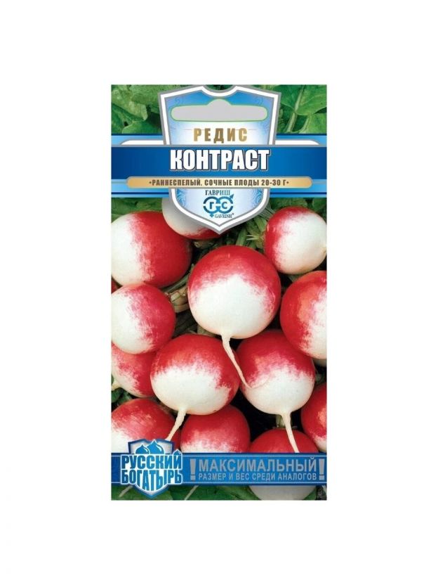 Редис является одним из самых ранних овощей и ценится за скороспелость, морозостойкость и свежий, чуть острый вкус, а также огромное количество витаминов и клетчатки. Сорт Контраст раннеспелый (22-23 дня от всходов до технической спелости). Розетка листьев полупрямостоячая. Корнеплод округлый или округло-эллиптический, красный с белым кончиком, массой 20-30 г. Мякоть белая, сочная, очень нежная. Хорошо растет в условиях недостаточной освещенности и при пониженных температурах долго не дрябнет. Вкусовые качества отличные. Чаще всего редис используют в свежем виде. Он хорош в салатах, окрошке.