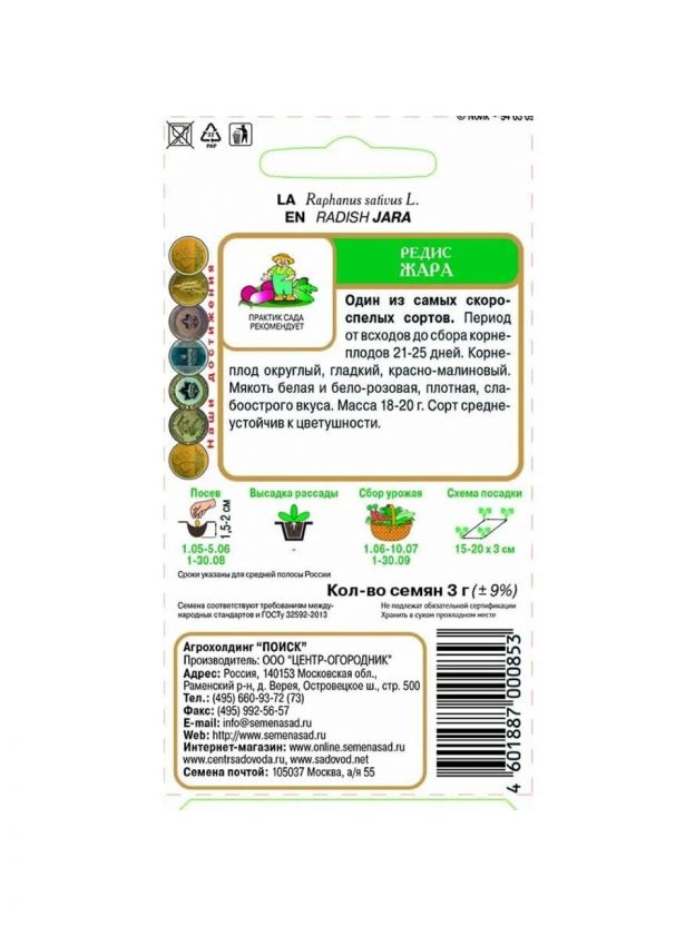 Один из самых скороспелых сортов. Период от всходов до сбора корнеплодов 21 день. Корнеплод округлый, гладкий, красно-малиновый. Мякоть белая и бело-розовая, плотная, слабоострого вкуса. Масса 18-50 г. Сорт среднеустойчив к цветушности.
