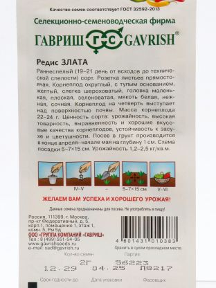 Семена редиса Злата от бренда Гавриш — это раннеспелый сорт с жёлто-золотистой кожурой и нежной мякотью. Благодаря высокой всхожести и устойчивости к стрелкованию, эти семена отлично подходят для выращивания в открытом грунте, парнике или даже на подоконнике. Модель Злата ценится за быстрый сбор урожая: всего 2 грамма в цветной упаковке обеспечивают полноценный посев на небольшом участке.