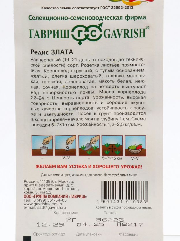 Семена редиса Злата 2 г Гавриш — быстрый урожай, сочные корнеплоды и надёжный старт сезона для вашего огорода или дачи.