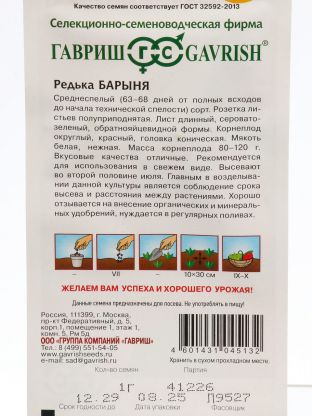 Семена редьки Барыня (китайская лоба) от бренда Гавриш — отличный выбор для тех, кто ищет, какую редьку выбрать для дачи или домашнего огорода. Этот сорт отличается крупными, сочными корнеплодами с нежным вкусом и минимальной горечью, что особенно важно для салатов и свежих закусок. Благодаря среднему сроку созревания, вы получите стабильный урожай уже через 63–68 дней после посева.