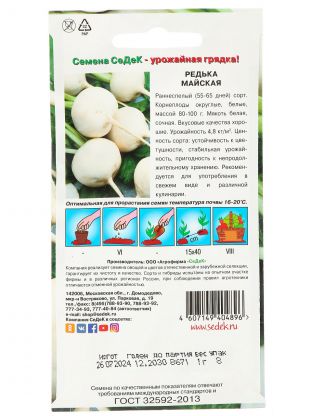 Семена редьки Майская от Седек поставляются в цветной упаковке, которая защищает содержимое от влаги и света, сохраняя всхожесть и качество до срока посадки.
